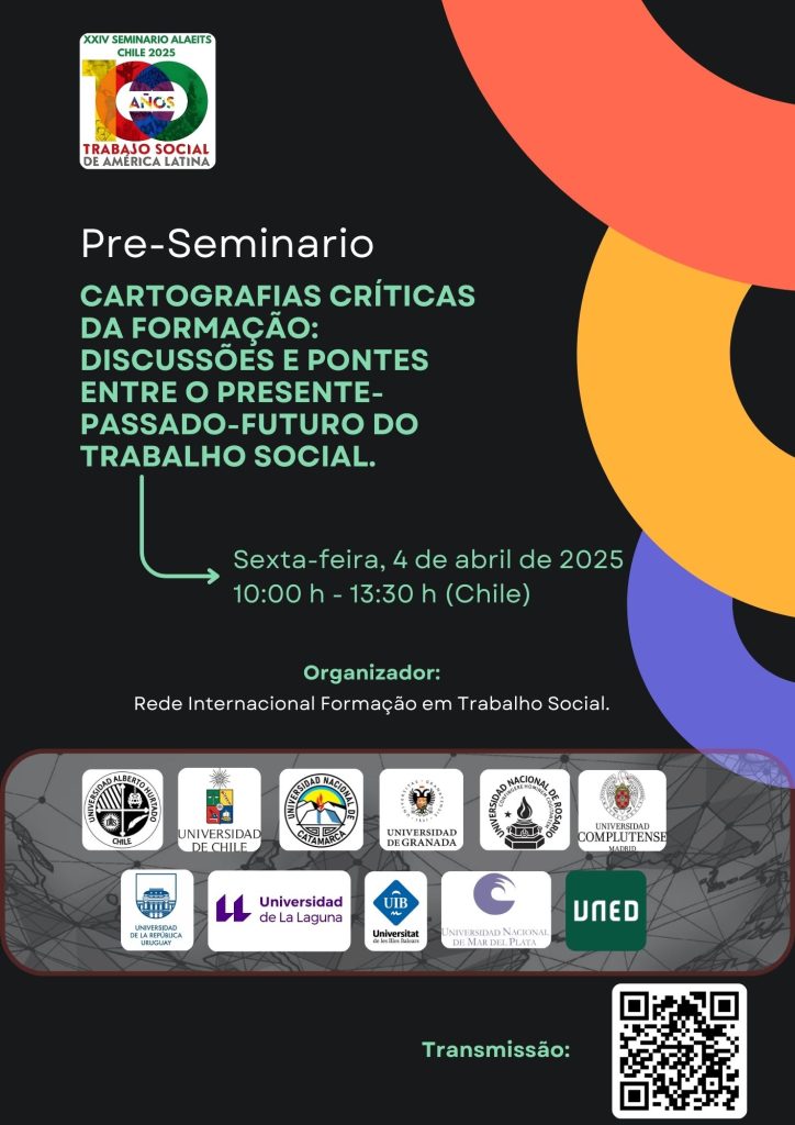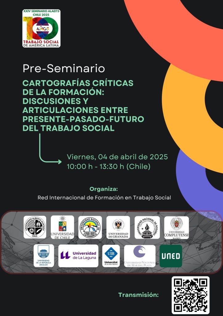 En nombre de la Red Internacional sobre Formación en Trabajo Social, tiene el agrado de invitarle al Pre-seminario “Cartografías críticas de la formación: discusiones y articulaciones entre presente-pasado-futuro del Trabajo Social” que se encuentra en el marco del XXIV Seminario Latinoamericano de Escuelas de Trabajo Social “Crisis civilizatoria, luchas contra hegemónicas y proyectos emancipatorios: Desafíos, rupturas y organización frente al avance ultraconservador”.