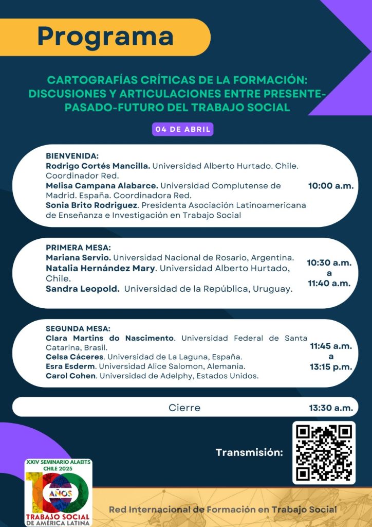 El encuentro se llevará a cabo el día viernes 04 de abril de 2025 en horario de 10:00 a 13:30 horas de Chile y se transmitirá por la plataforma YouTube del Departamento de Trabajo Social de la Universidad Alberto Hurtado de Chile (http://www.youtube.com/@departamentodetrabajosocia4409).